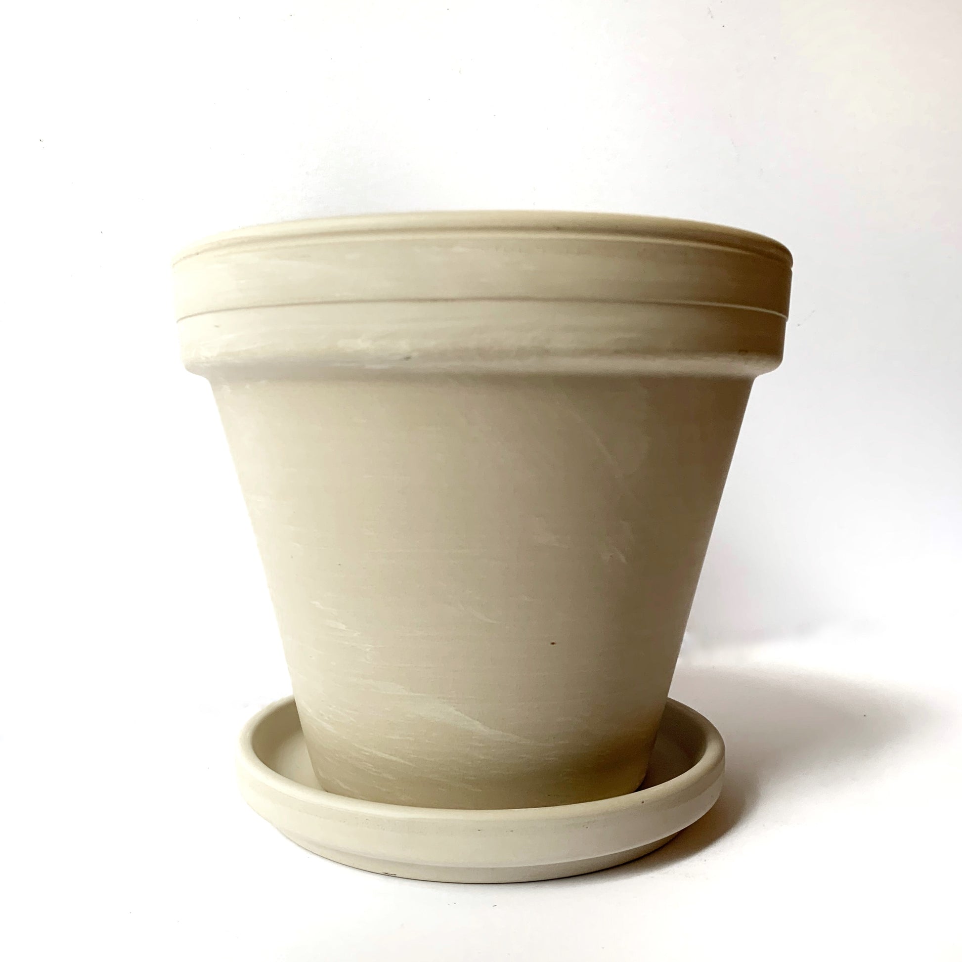 Pot en terre cuite avec trou de drainage et soucoupe.